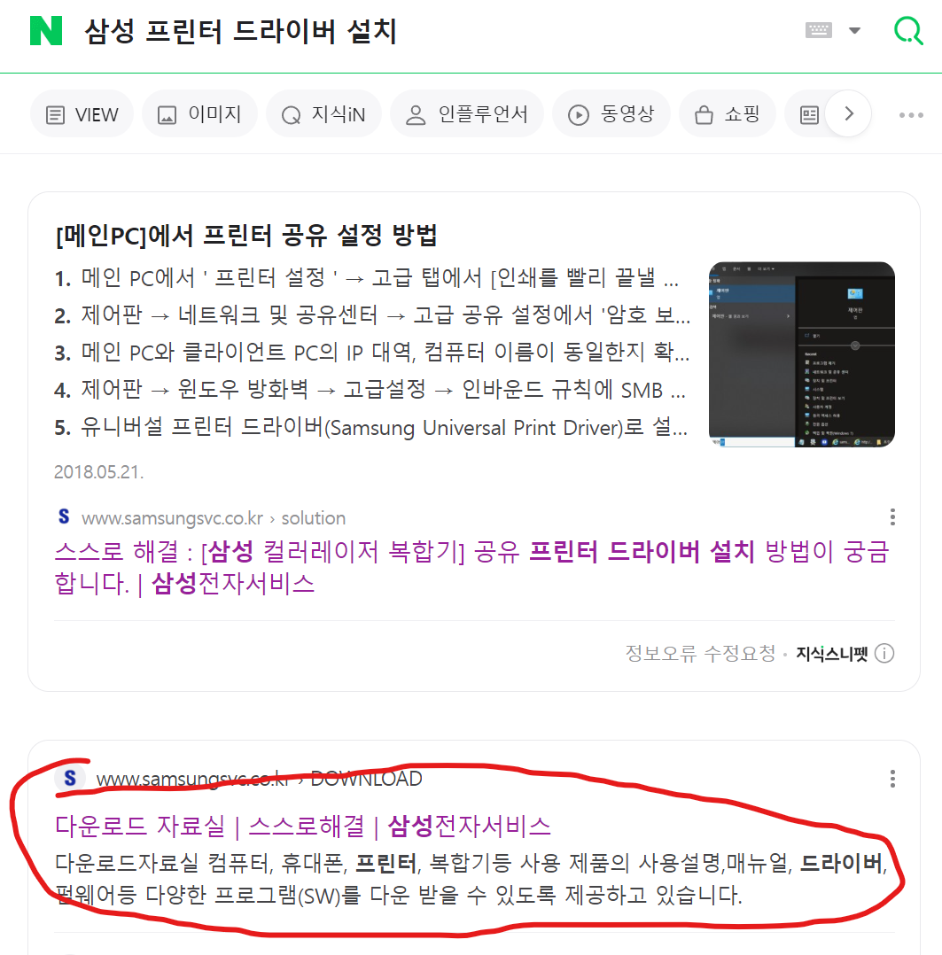 먼저 검색창에 삼성 프린터 드라이버 설치 라고 검색해 주세요. 그럼 아래 사진에서 다운로드 자료실 클릭해주시면 됩니다.