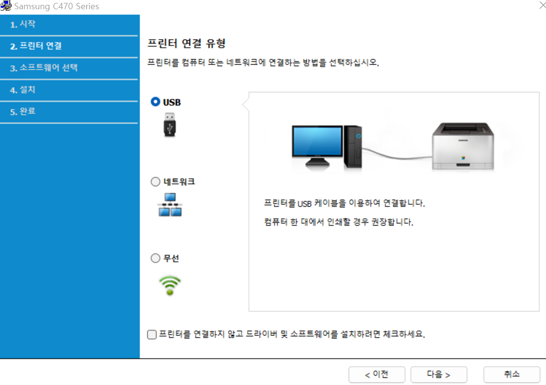 그럼 무엇으로 연결되어있냐를 물어볼겁니다. 보통은 usb로 이어져 있지만 회사나 사무실 같은곳은 네트워크를 사용하실 겁니다. 무선같은경우는 프린터가 블루투스 동글등을 이용해 무선으로 이어져 있으면 무선을 선택해주세요. 저는 usb 방식으로 연결되어 있기때문에 usb를 선택하겠습니다.