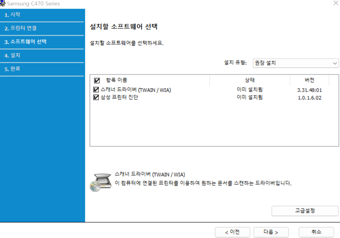 그럼 위 화면처럼 체크박스가 나타날텐데 저는 다 체크해 줍니다. 여러가지 알람을 잘 표시해주어서 편하더라고요. 너저분하게 설치하는게 싫으신 분들은 체크 해제해 주세요. 저는 이미 설치가 되어있어서 이후에 진행하지 않았는데 저상태로 다음을 눌러주시면 프린터 드라이버 설치가 완료 되었습니다.