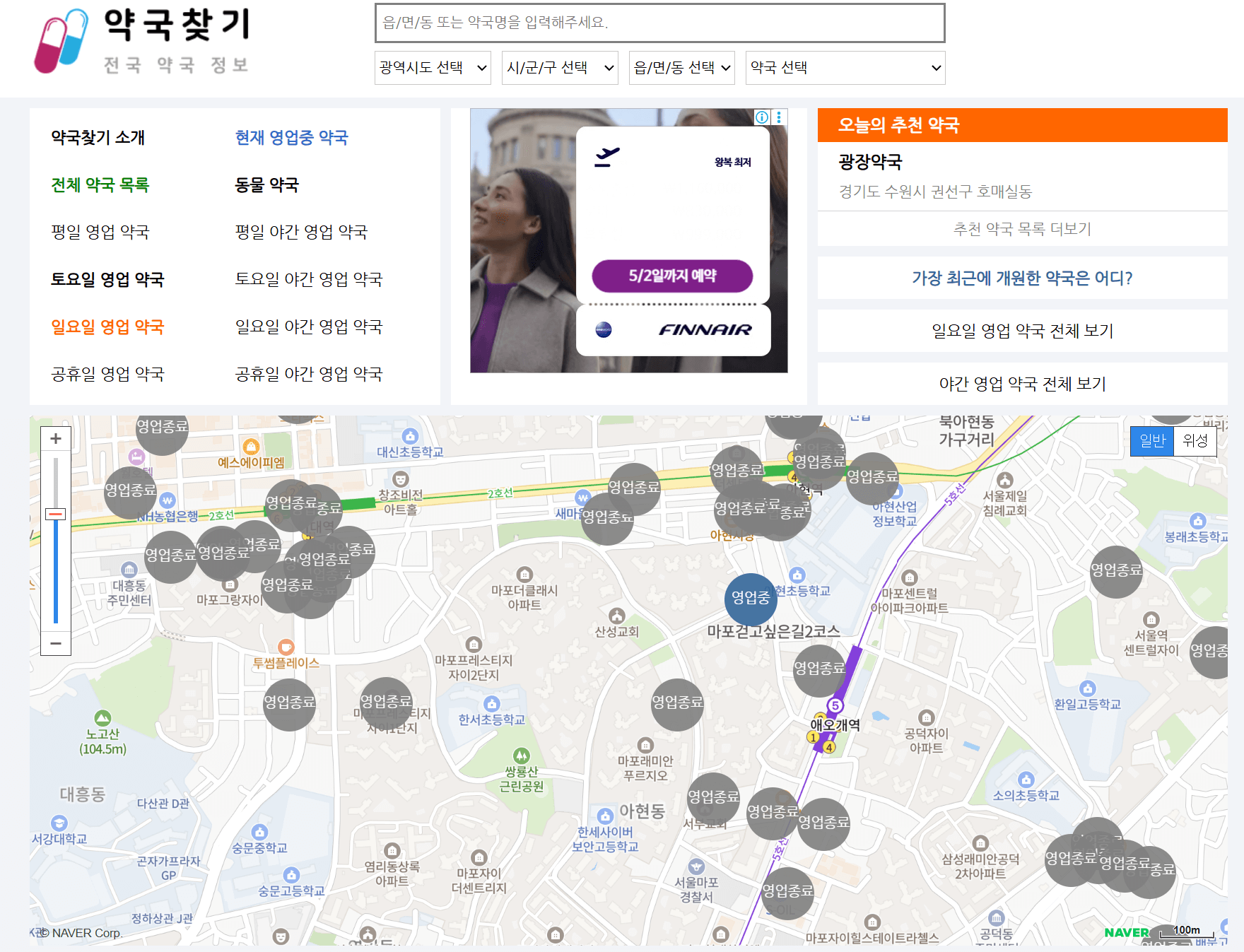 '응급의료포털' 사이트는 주말뿐만 아니라 심야, 공휴일 에 운영하는 약국정보를 제공하며, 병원 정보도 함께 확인 할 수 있습니다. 이 사이트를 이용하면 내 주변에 운영중인 약국/병원을 지도를 통해 확인할 수 있습니다.