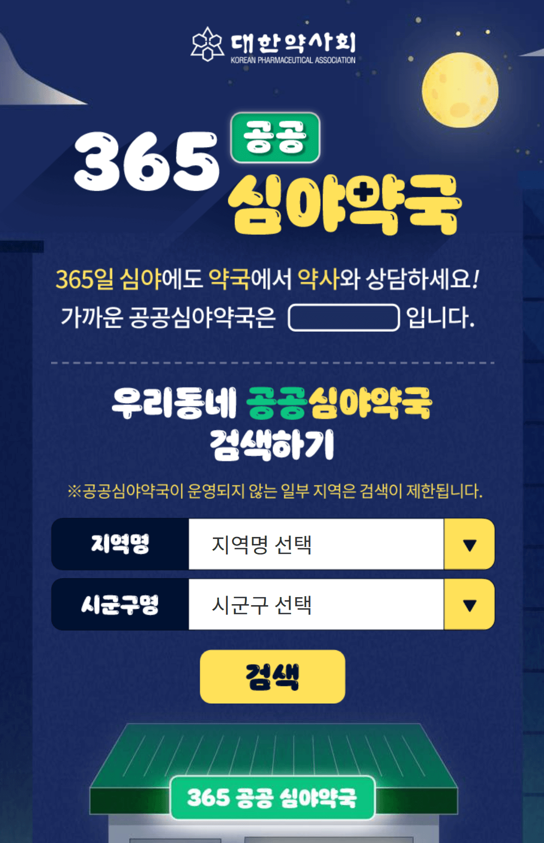 '365 심야약국'은 대한약사회에서 연중무휴, 밤 10시부터 새벽1시까지 운영하는 약국 알려줍니다. 이 약국들은 365일 연중무휴로 운영되고 늦은시간 약국을 찾을때 매우 유용합니다.
