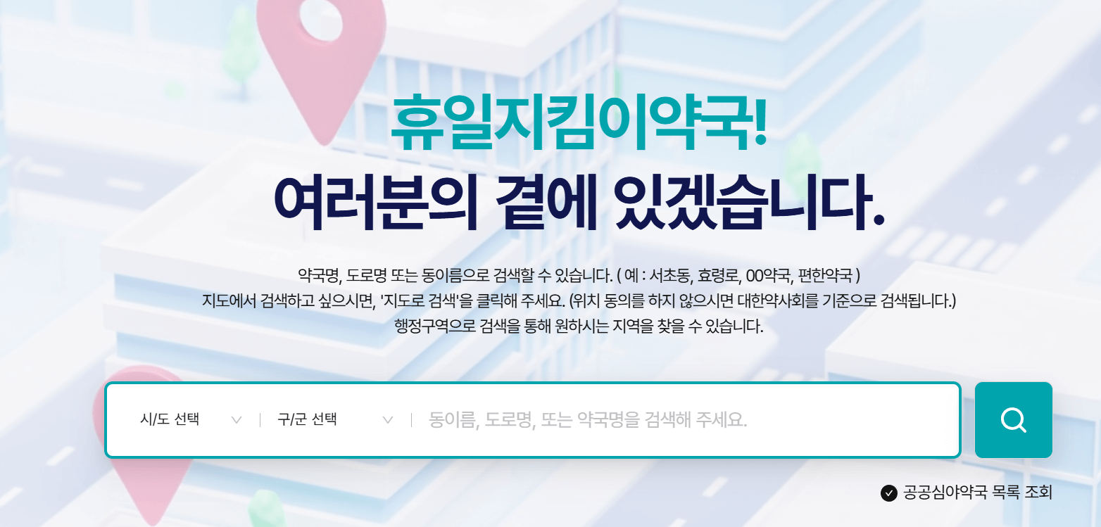 ‘휴일지킴이 약국’은 보건복지부와 건강보험심사평가원이 운영하는 공휴일/야간 약국 검색 시스템입니다. 응급 상황에 대비해 설날, 추석, 일요일, 임시공휴일 등에도 운영하는 약국 정보를 제공합니다.