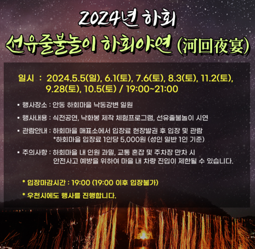 2024년 안동 하회마을에서 불꽃놀이 하회선유줄불놀이가 개최되고 있다고 합니다. 5월부터 11월 매월 1회씩 진행하고 있으면 총 7회이며 우천 시에도 진행이 된다고 합니다! 아직 가보지 못하시거나 가실 예정이라면 8, 9, 10, 11월 미리 일정알아보시고 좋은 명당자리 잡아놓으세요!