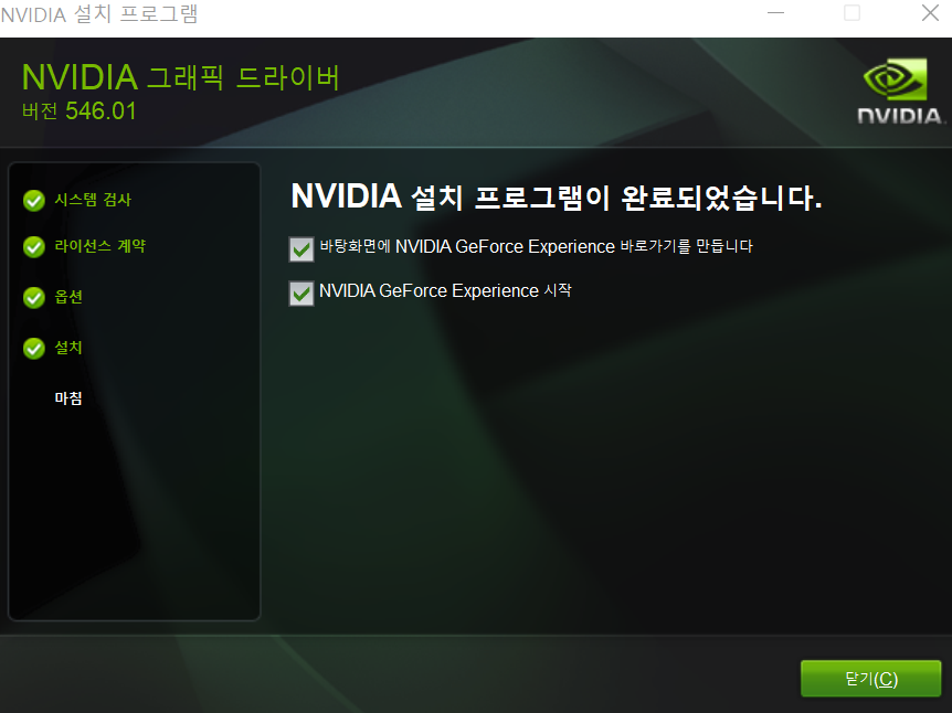 다운로드를 하고 아래 화면이 뜨면 완료 된 것 입니다. 여기서 끝이 아닙니다!!! 여기서 완료하시고 마치시는 분들이 많이 계신데 이것 까지 해야 모니터와 그래픽카드를 제대로 쓰신거라 생각합니다. 바탕화면에서 마우스 우클릭을 해주세요.