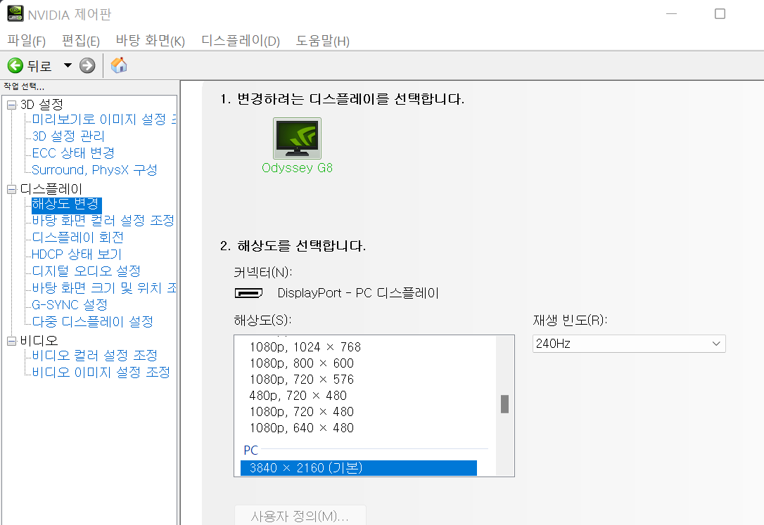 디스플레이>해상도 변경을 들어가시면 저와 똑같은 화면이 보이실 겁니다.