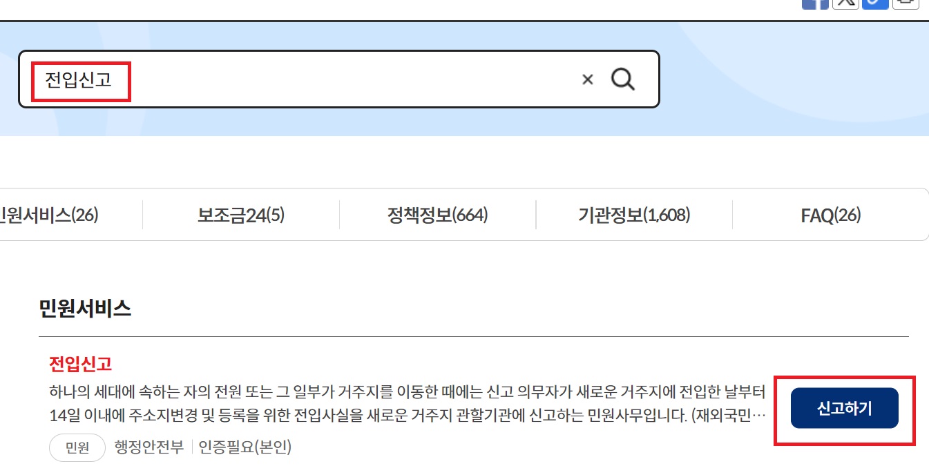 2. 전입신고 검색 후 신고하기 클릭