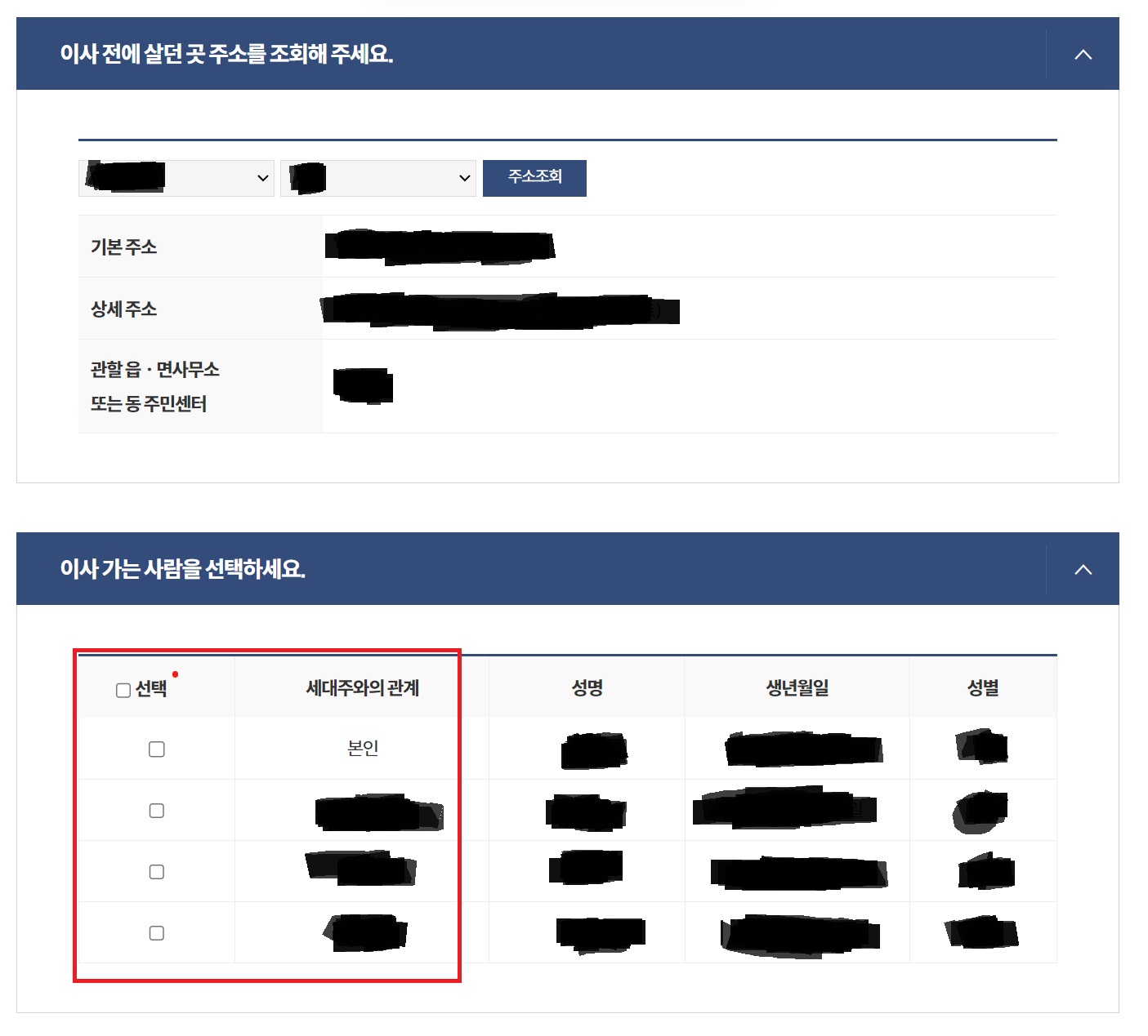- 가족모두가 이사 가는 경우 전체를 선택, 일부만 이사 가는 경우 해당 구성원만 선택