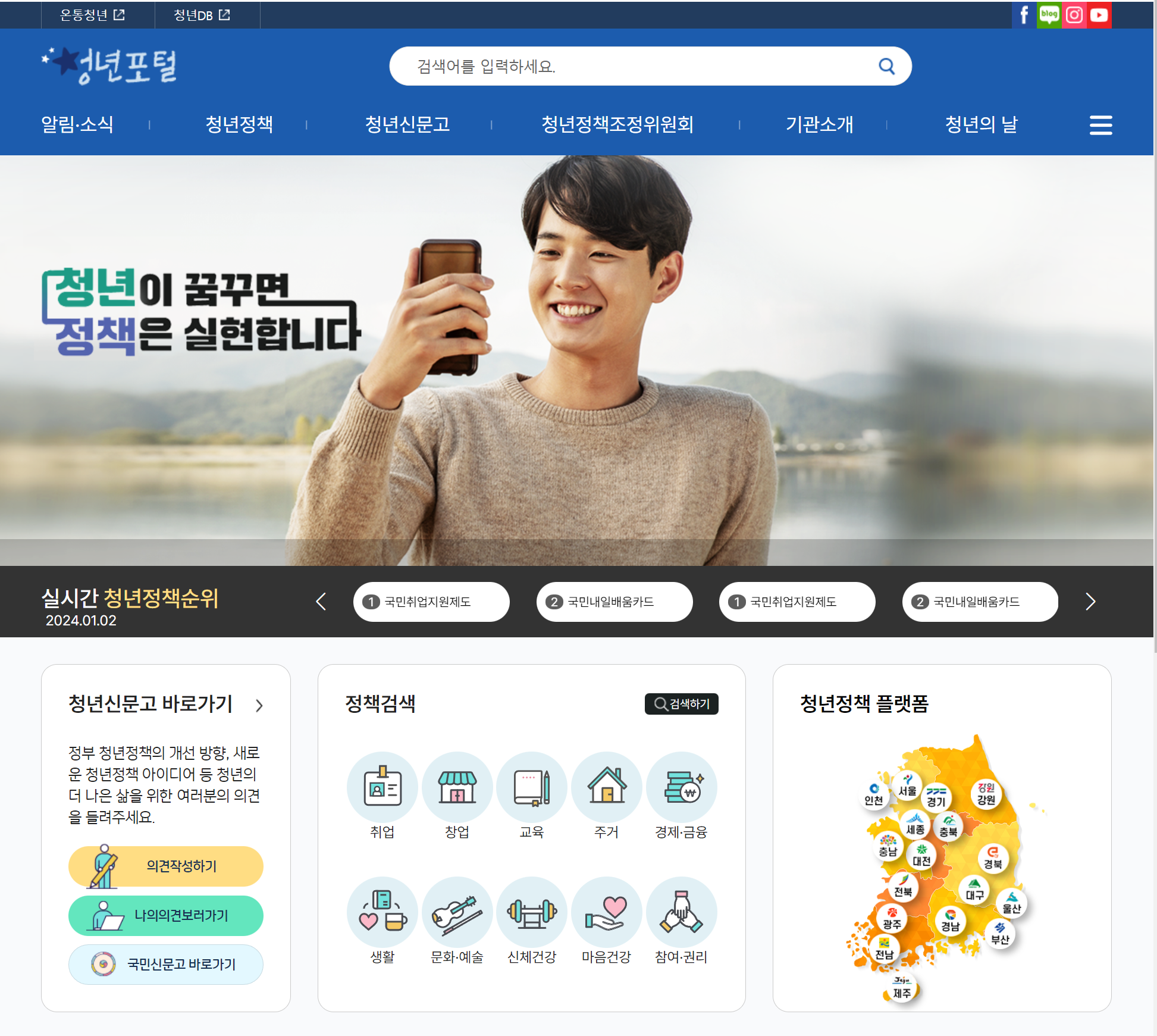 - 전국 청년 정책, 청년 소식 등 청년에 관련되 내용을 전반적으로 다루는 누리집
