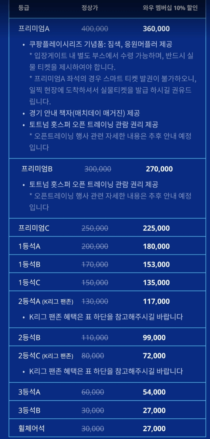 서울 월드컵 경기장 프리미엄석은 25~40만 원, 1등석 25~20만 원 2등석 8~13만 원, 3등석은 3~6만 원이고와우 멤버십은 10% 할인된 가격에 티켓 구매가 가능합니다.