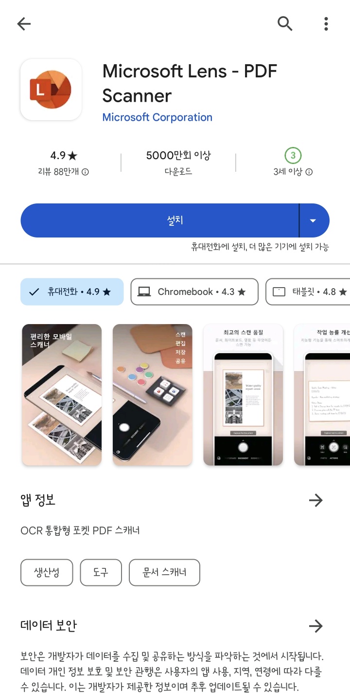 다양한 모바일 어플이 있지만 저는 마이크로소프트사의 공식 어플인 [마이크로소프트 렌즈]를 이용한 스캔방법을 알려드릴려고 합니다. 평점도 4.9점이며 무료이니 아래버튼을 통해 다운로드 받으세요.