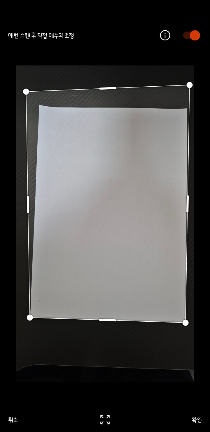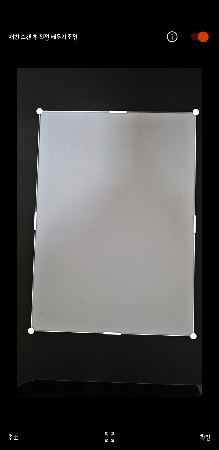 3. 혹여나 카메라 오류로 테두리를 제대로 잡지 못하였다면 수동으로 잡아주세요. 완료 시 확인 클릭