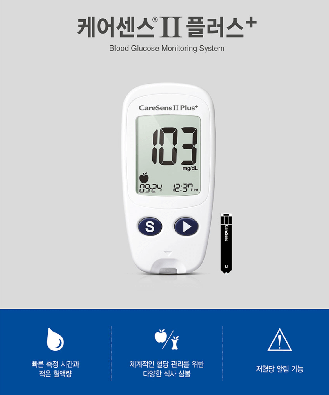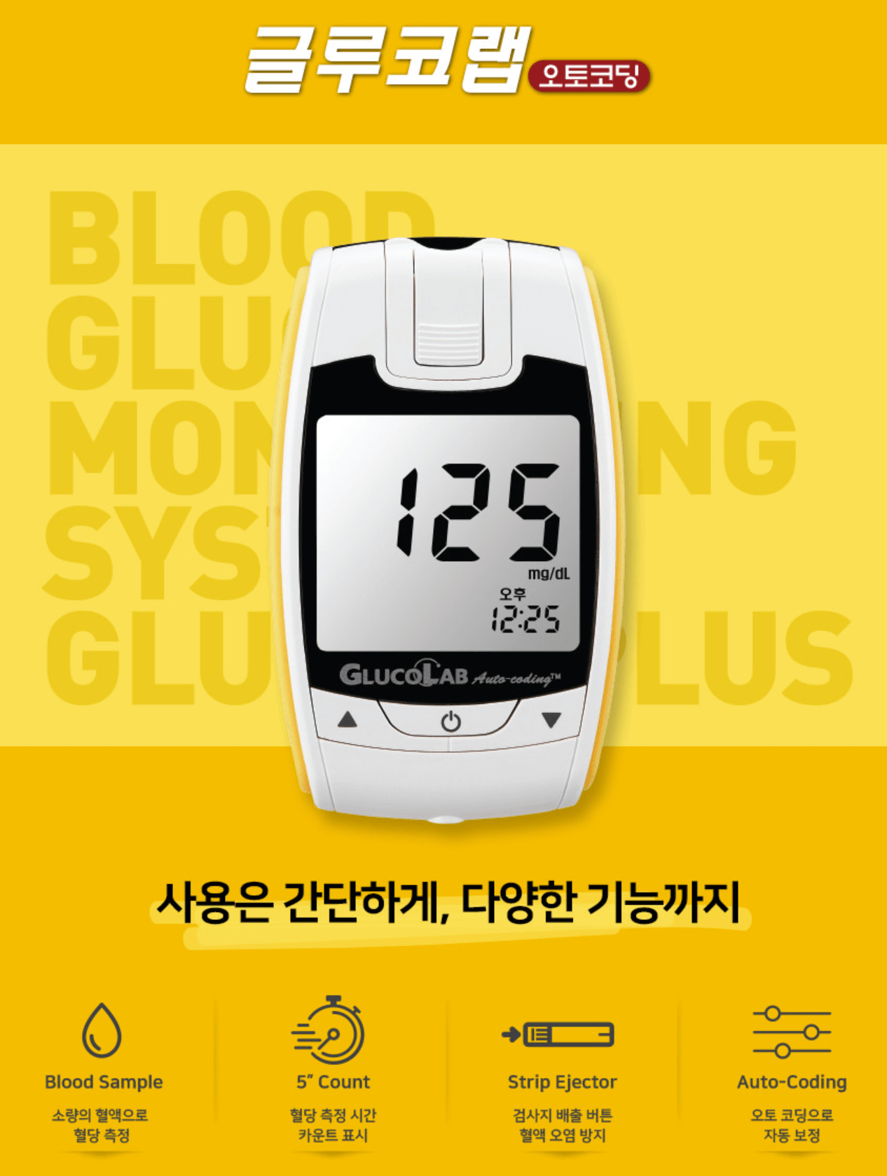 - 언제 어디서나 간편하게 휴대가 가능하며, 측정까지 5초의 카운트 시스템으로 신속하게 혈당관리를 할 수 있습니다.