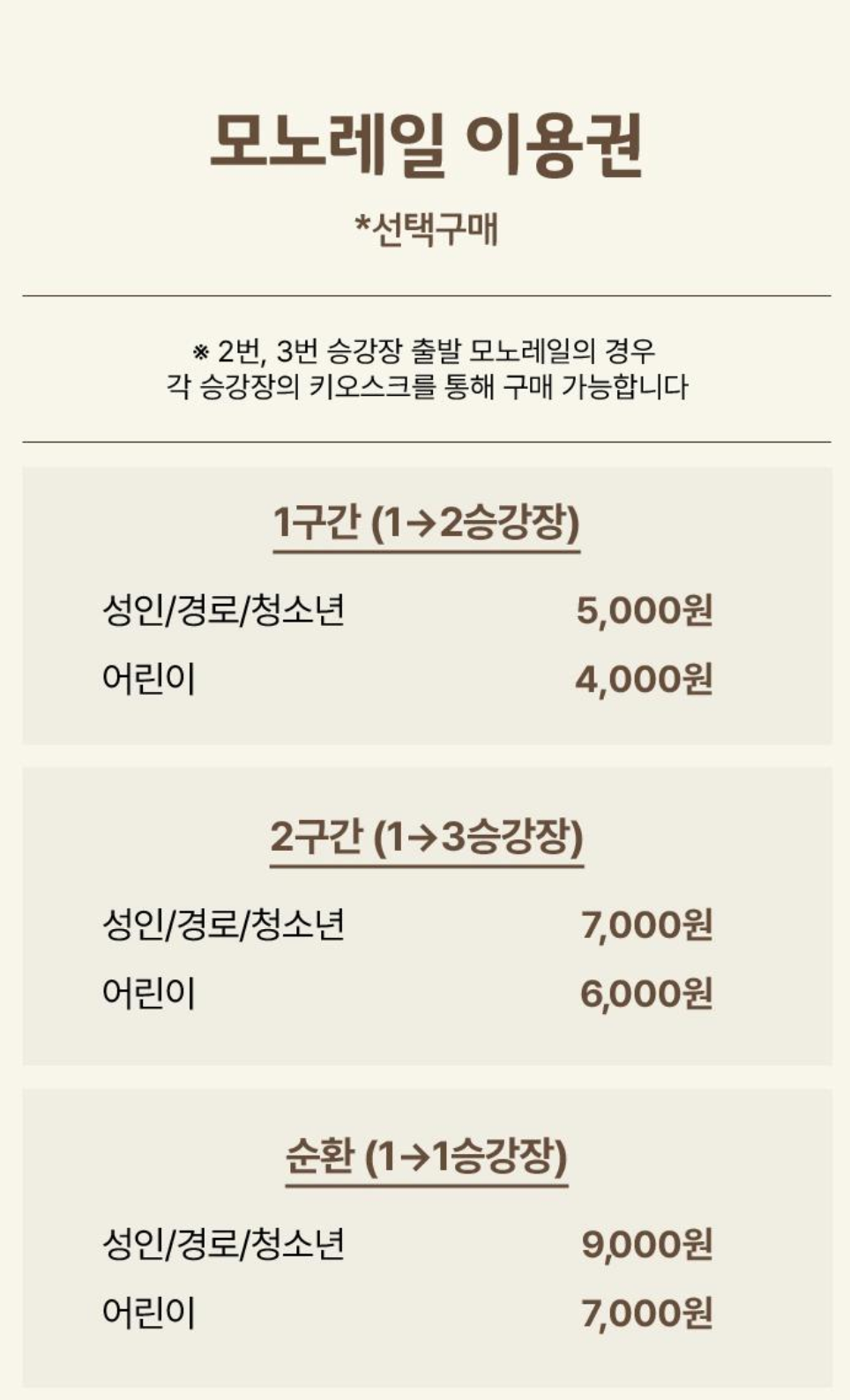 아래버튼을 통해 모노레일 코스 및 가격표에 대해 자세히 알아보실 수 있습니다.