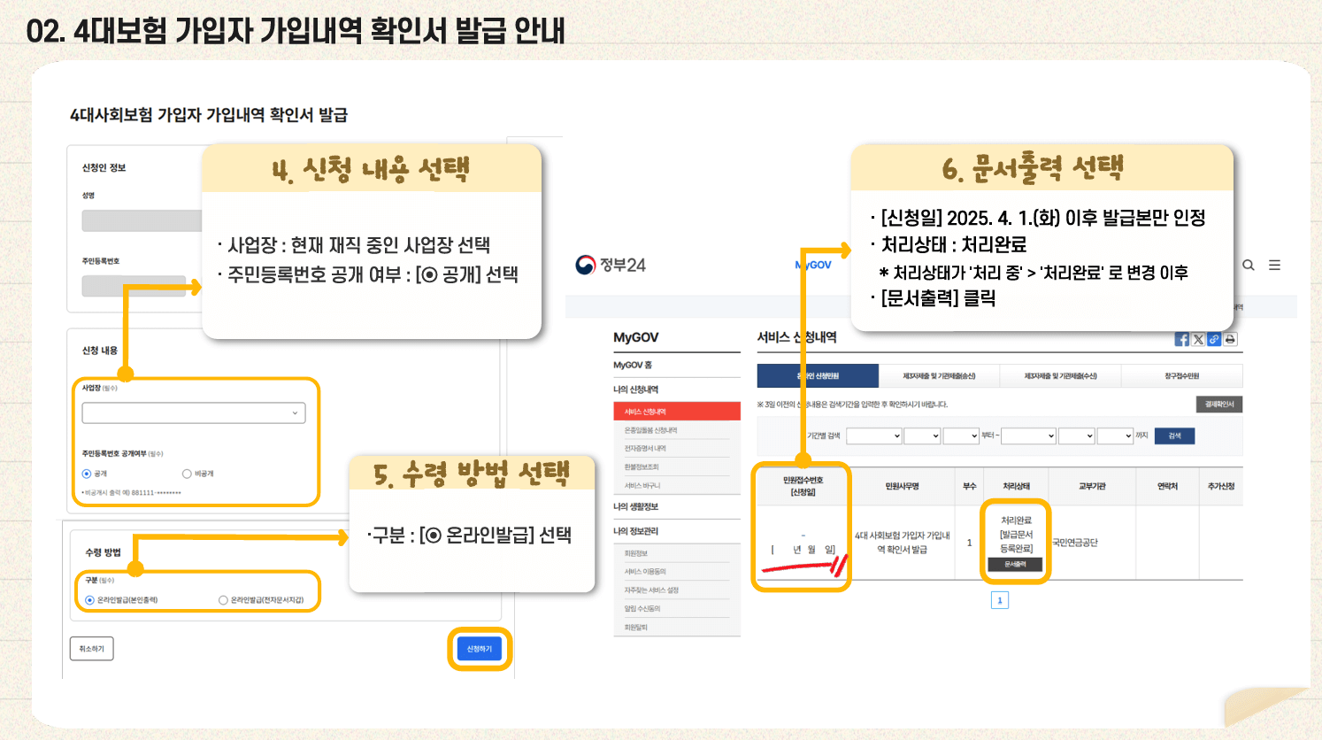 4.'신청 내용/수령방법/ 문서출력' 선택