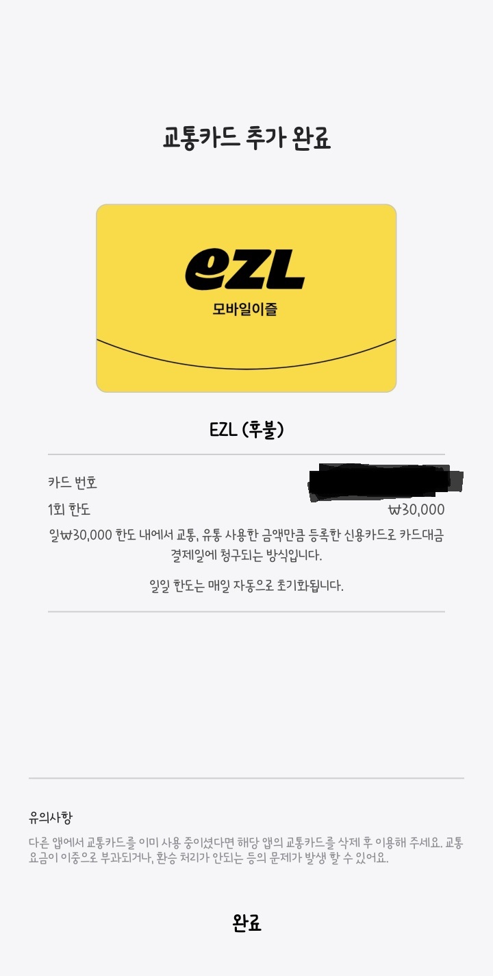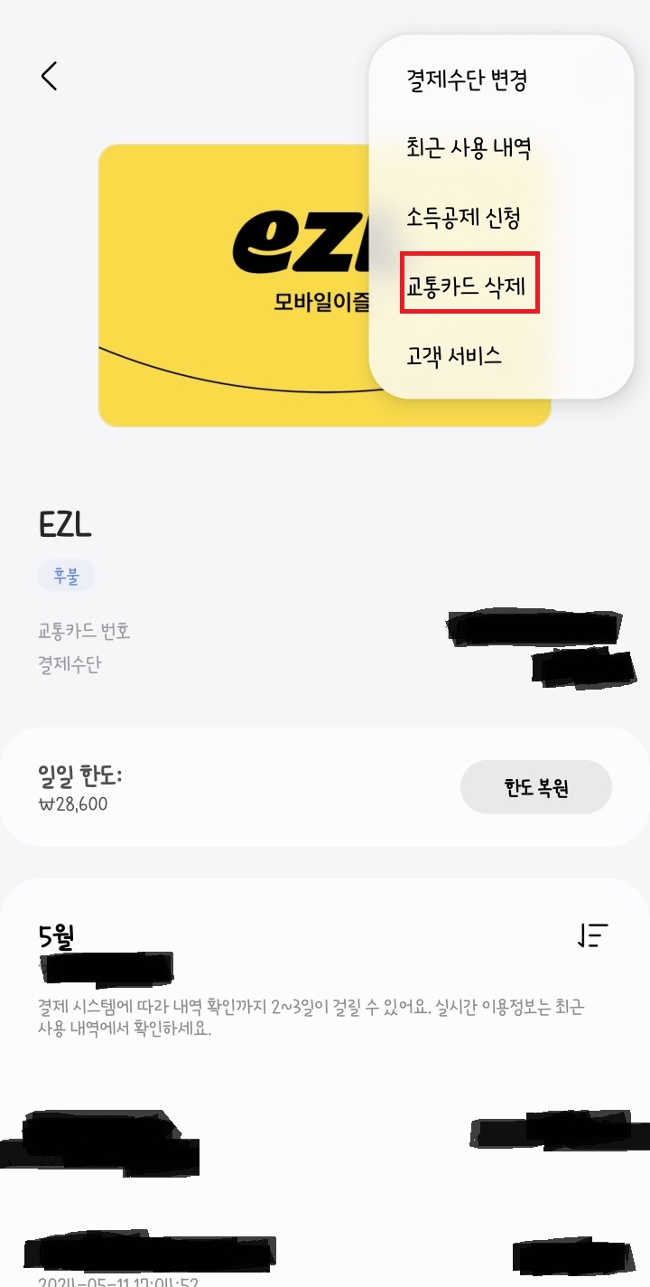 - 기존등록된 교통카드를 삭제를 해주시길 바랍니다.
